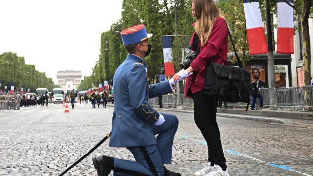 阅兵前,一军人在“香街”求婚,得到总统祝福。晚间是巴黎铁塔音乐及烟火晚会