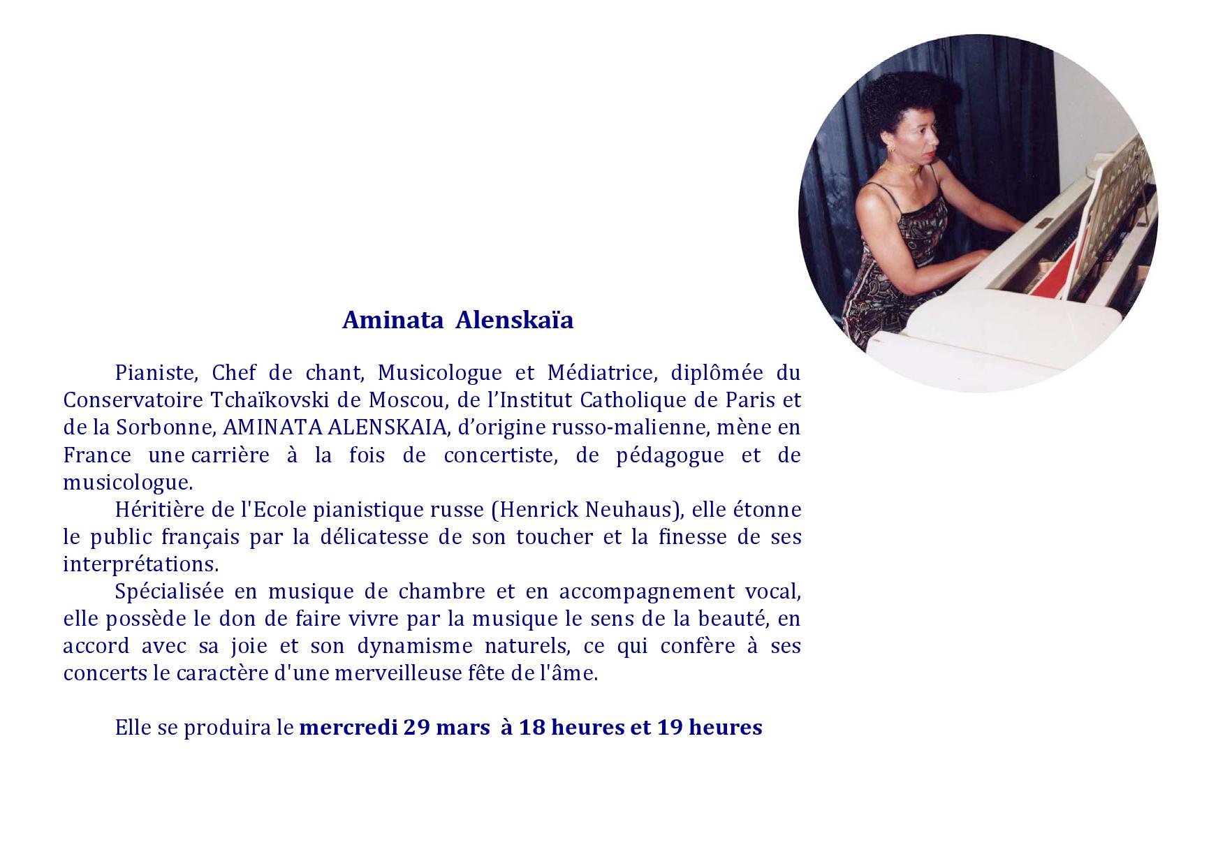 Pianiste, Chef de chant, Musicologue et Médiatrice, diplômée du Conservatoire Tchaïkovski de Moscou, de l’Institut Catholique de Paris et de la Sorbonne, AMINATA ALENSKAIA, d’origine russo-malienne, mène en France une carrière à la fois de concertiste, de pédagogue et de musicologue.
